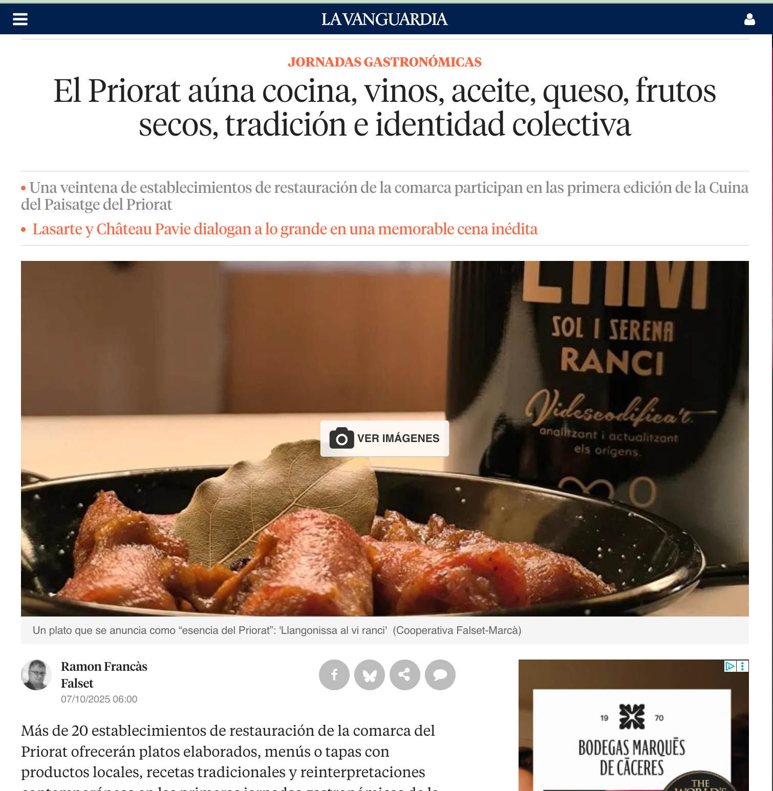 Ramón Francàs, a La Vanguardia ,fa ressò de les I Jornades de la cuina del paisatge del Priorat